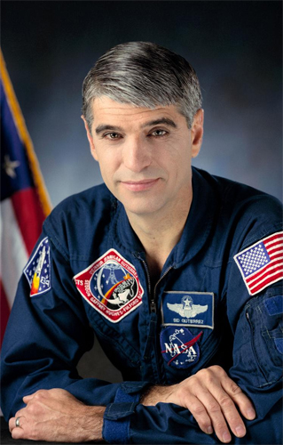Sidney Gutierrez on the flight deck of the Space Shuttle Endeavour.
